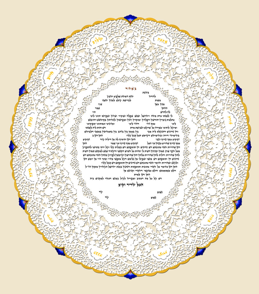 WHITE LILIES KETUBAH - Papercut, with hand-added gold leaf, $580 (includes shipping). Personalization, $75. 44.5 x 40.5 cm.